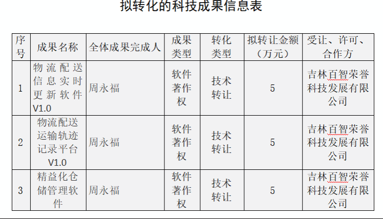 根据《中华人民共和国专利法》《中华人民共和国促进科技成果转化法》《吉林交通职业技术学院科技成果转化管理办法(试行)》等相关规定,经协议定价,全体发明人同意,拟将学校3项软件著作权以技术转让的形式、共计15万元的价格转让给吉林百智荣誉科技发展有限公司,具体情况见下表。