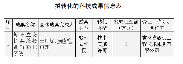 根据《中华人民共和国专利法》《中华人民共和国促进科技成果转化法》《吉林交通职业技术学院科技成果转化管理办法(试行)》等相关规定,经协议定价,全体发明人同意,拟将学校1项软件著作权以技术实施许可的形式、5万元的价格转让给吉林省致远工程技术服务有限公司,具体情况见下表。